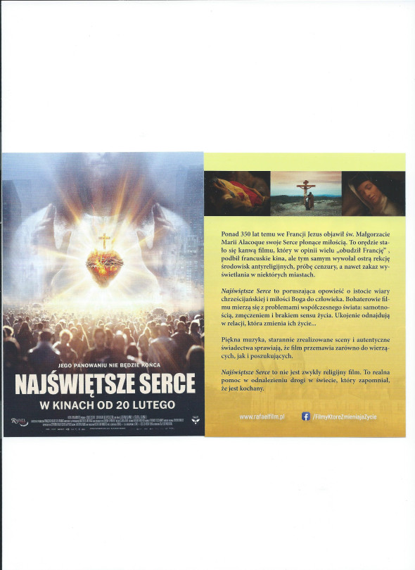 Ze względu na ogromne zainteresowanie filmem "Najświętsze Serce" i wykupieniem już prawie wszystkich biletów na sobotni premierowy seans organizowany przez ChKF ICHTHYS przy legnickim kinie "Piast"... ; kierownictwo kina proponuje dwa dodatkowe projekcje tego tytułu: 28 lutego br, o godzinie 11:30 i 1 marca br, o godzinie 12:45. Oba seanse są seansami zbiorowymi.