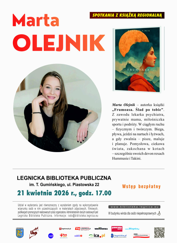 Gościem spotkanie będzie Marta Olejnik - autorka książki „Frumoasa. Ślad po tobie”. Z zawodu lekarka psychiatra, prywatnie mama, miłośniczka sportu i podróży. W ciągłym ruchu - fizycznym i twórczym. Biega, pływa, jeździ na nartach i łyżwach, a gdy zwalnia - pisze, maluje i planuje. Pomysłowa, ciekawa świata, zakochana w kotach - szczególnie swoich devon rexach Hummusie i Takini.