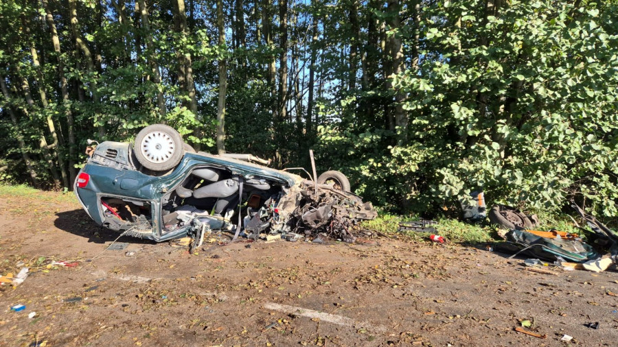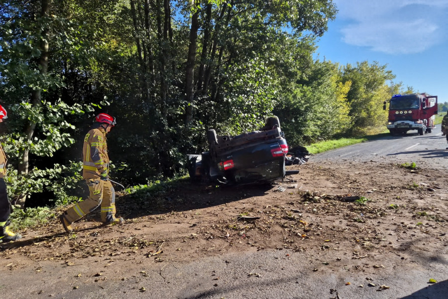 Dziś na drodze między Legnicą a Koskowicami doszło do poważnego zdarzenia drogowego.Ze wstępnych ustaleń wynika, że kierujący pojazdem marki Volvo, jadąc od Legnicy w kierunku Koskowic, na łuku drogi rozpoczął manewr wyprzedzania jadącego przed nim VW Golfa. W trakcie wyprzedzania zauważył nadjeżdżający z przeciwnego kierunku pojazd i próbował wrócić na swój pas ruchu. Wtedy uderzył w golfa, a następnie zjechał z drogi, uderzył w drzewo i dachował – informuje komisarz Jagoda Ekiert, oficer prasowy legnickiej policji.