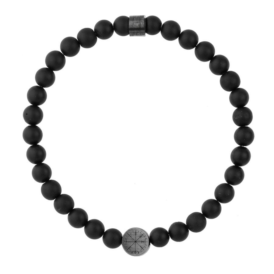 Kolejną ciekawą propozycją męskiej biżuterii jest nordycka bransoletka Wikingów z runami ochronnymi. To model, który prezentuje się niezwykle atrakcyjnie i prestiżowo na każdym, męskim nadgarstku. Do produkcji bransoletki użyte zostały matowe kamienie turmalinu w intensywnie czarnym kolorze. To kamień, który znany jest ze swoich niezwykle silnych właściwości ochronnych. Co ważne, dawniej wierzono, że turmalin posiada zdolności pochłaniania złej, negatywnej energii. Dzięki temu, noszenie takiej bransoletki nie tylko znacząco podnosi walory estetyczne tworzonych stylizacji, ale także pomaga w utrzymaniu dobrego nastroju. Bransoletka nawleczona jest na wytrzymałą, jubilerską gumkę, która zapewnia komfort noszenia i trwałość, nawet pomimo intensywnej eksploatacji. Model dzięki gumce dopasuję się do każdego, męskiego nadgarstka, jednocześnie nie ograniczając ruchów. To sprawia, że może być to również wymarzony prezent dla każdego mężczyzny na wiele okazji.