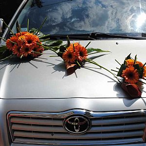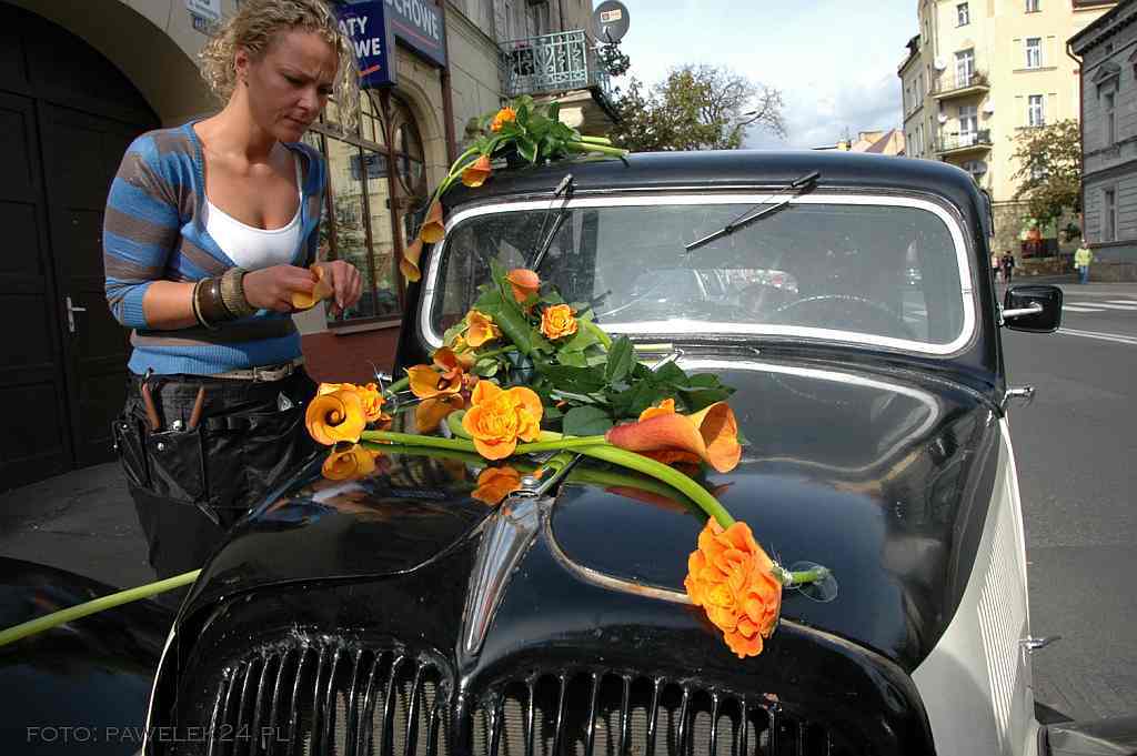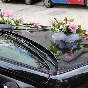 Może i auto nie jest najważniejszą częścią oprawy ślubnej, ale muszę przyznać, że jest wspaniałym polem do popisu dla florysty. W kwiaciarni, w której będzie przygotowywana wiązanka ślubna dobrze jest zamówić także dekoracje samochodu. Powinna ona współgrać z kolorem, jak i stylem auta. Często dopasowuje się także do bukietu Panny Młodej. W praktyce wygląda to tak, że kiedy widzę parę wchodzącą do kwiaciarni, dziewczynie wręczam katalog z bukietami a jej partnerowi album z dekoracją samochodów. I tu moja rada, wiem dziewczyny, że chcecie wszystko wybrać same, po swojemu, ale pozwólcie facetom też się wykazać. Czuja się oni wtedy tak bardzo ważni, i cieszą się, że mogą też o czymś zadecydować. Bo nie oszukujmy się, najczęściej bywa tak, że w trakcie przygotowań do ślubu najczęściej są angażowani tylko w prace fizyczne, typu przywieź, zawieź, dostarcz. Załatwmy to tak, żeby czuli się potrzebni i dowartościowani "artystycznie", a nie tylko fizycznie. Wszystko oczywiście w granicach zdrowego rozsądku, pamiętajmy jednak, że facet to facet. I dlaczego czasami musimy zrobić tak, żeby to on myślał, że podjął decyzje, a jak jest to najlepiej wiecie same. Bo niestety zdarza się jeszcze, że na ulicach miasta widząc korowód ślubny dostaję osobiście palpitacji serca. Dlaczego? Staje się tak za sprawą tzw. "sztuczności". Mam tu na myśli pluszowe misie, lalki, plastikowe kwiaty i wstążki. Warto kierować się zasadą stylistycznego dopasowania wszystkich elementów. Mężczyźni nie zawsze o tym wiedzą. I często wydaje im się, że dużo i bogato znaczy dobrze. A nie zawsze tak jest. Przykład – auto w stylu retro. Jeżeli zdecyduje cie się już na takie, to pamiętajmy, że taki samochód ma tyle uroku sam w sobie, że czasami wystarczy tylko mała dekoracja z przodu maski, cztery kokardy na klamki i już wygląda to dobrze. Nieraz oczywiście bogatsza kompozycja zrobi większe wrażenie. Wybór kwiatów i dodatków oraz kształtu całości zależy od fantazji i umiejętności florysty, a także od życzenia młodej pary. Dobrze zrobiona dekoracja musi spełniać trzy warunki: jej mocowanie musi być solidne, a zarazem łatwe do demontażu, nie może narażać lakieru na uszkodzenia ani zasłaniać kierowcy widoku. Reszta, to już czysta przyjemność komponowania...