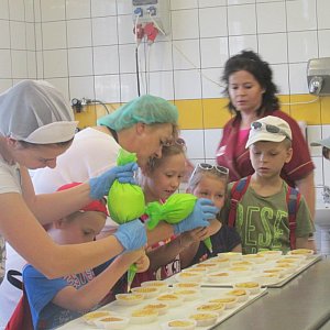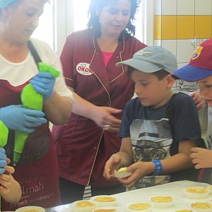 Jednak te wszystkie atrakcje odpłynęły w dal, gdy na horyzoncie pojawiła się najprzyjemniejsza – deserowa część zakładu. To tutaj powstają torty i smakowite ciasteczka, które łasuchy lubią najbardziej! Panie przygotowały dla dzieci babeczki, które następnie maluchy własnoręcznie udekorowały masą budyniową i dowolnymi dodatkami. A było z czego wybierać! Brzoskwinie, ananasy, winogrona, czekolada własnej produkcji i mnóstwo kolorowych posypek.