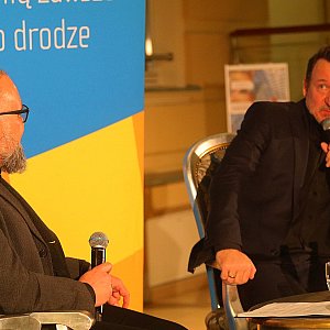 Bohater wieczoru mówił o swojej pracy i karierze aktorskiej. Mówił bardzo wiele i bardzo interesująco. Prowadzący spotkanie Marcin Andrzejewski nie miał zbyt wiele pracy. Robert Więckiewicz to pełen charyzmy człowiek i niespożytej energii człowiek. Znakomity gawędziarz, a barwne historie które opowiadał, z pewnością mogłyby posłużyć za scenariusz niejednego filmu. Znakomity gawędziarz, a barwne historie które opowiadał, z pewnością mogłyby posłużyć za scenariusz niejednego filmu. Dodać należy, że aktor ma w swoim życiorysie incydent sportowy. Był piłkarzem jednak dobrze zapowiadającą się karierę sportowca przerwała kontuzja. Próbował swoich sił także jako muzyk, na gitarze grać nauczył się w internacie jednak na scena muzyczna go pociągała. Barwnych opowieści słuchała także jego szkolna polonistka Bogumiła Słomczyńska, sądząc po jej uśmiechu niektóre z nich usłyszała po raz pierwszy.
