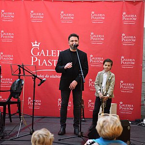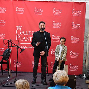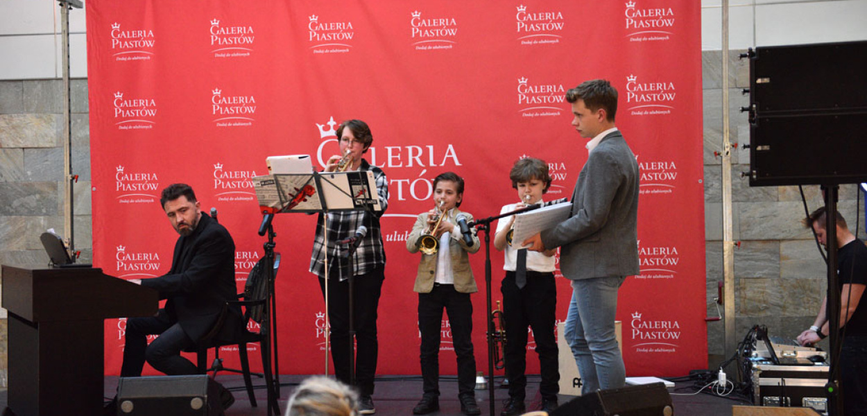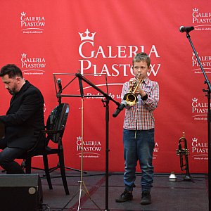 Adepci trąbki i ich nauczyciel i mistrz - Patrycjusz Gruszecki, umilali klientom Galerii Piastów sobotnie popołudnie. Wystąpił także zespół Jazz Combo.