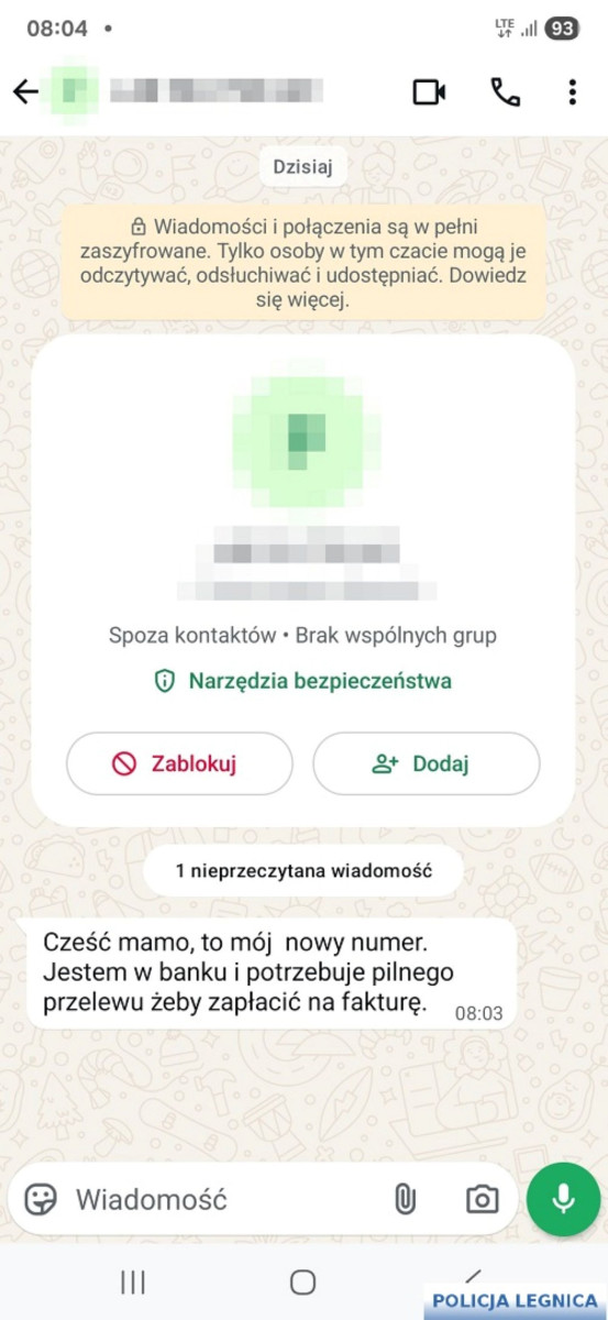 Policjanci podkreślają, że podobne zgłoszenia trafiają do nich coraz częściej. Schemat działania oszustów jest niemal zawsze ten sam. Najpierw kontaktują się przez popularny komunikator, podszywając się pod kogoś z rodziny. Zwykle tłumaczą, że „zepsuł im się telefon” albo „mają nowy numer”. Potem proszą o szybki przelew, najczęściej tłumacząc się „nagłą sytuacją”, jak opłata rachunku, kaucja czy awaria samochodu.