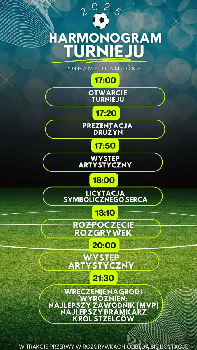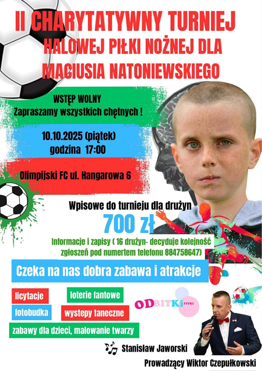 Od godziny 18:00 na boisku zmierzą się lokalne drużyny, a każdy mecz będzie okazją do wsparcia szczytnego celu. Dochód z turnieju w całości trafi na rzecz Maciusia Natoniewskiego. Organizatorzy przygotowali także liczne atrakcje dla kibiców i rodzin, które uczynią ten wieczór prawdziwym świętem sportu i dobroczynności.