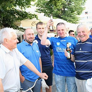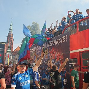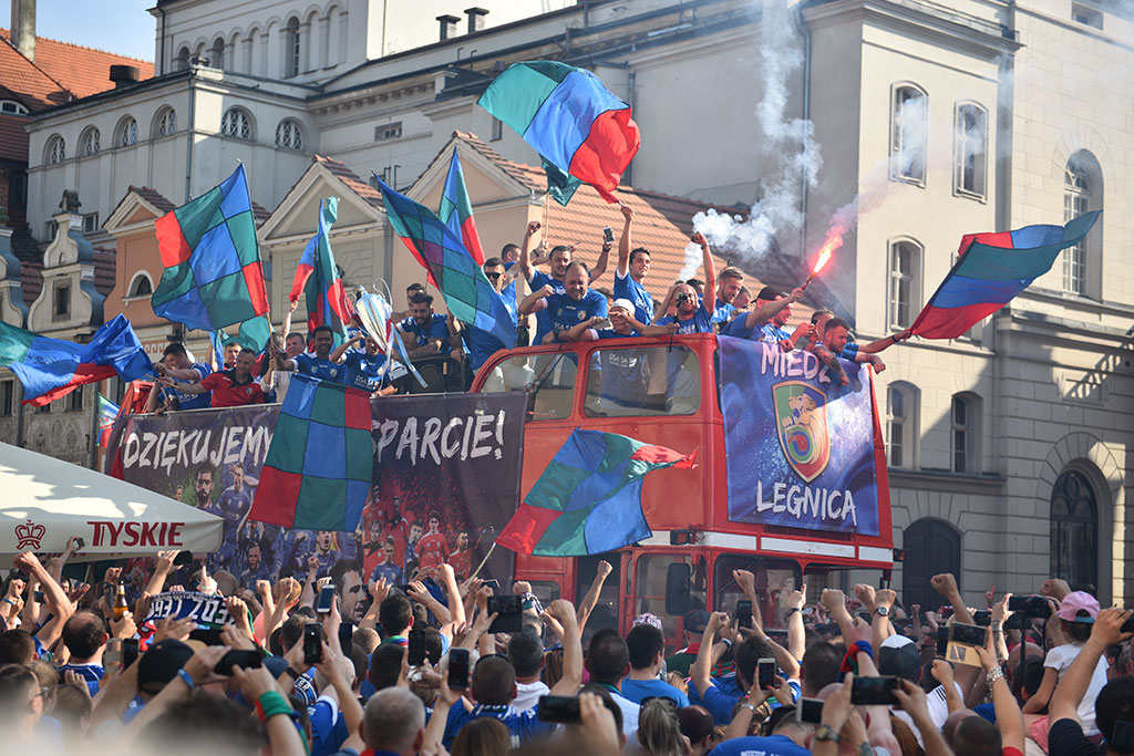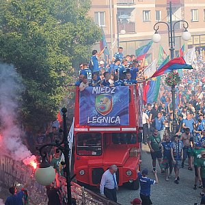 Nie zabrakło naturalnie konfetti, tryskających szampanów i śpiewów. Potem feta przeniosła się do miasta. Tuż po godz. 17 piłkarze Miedzi wykonali rundę po rynku autobusem z otwartym dachem. Były fajerwerki, chóralne śpiewy i morze alkoholu. Na szczęście też spokojnie, bez incydentów.