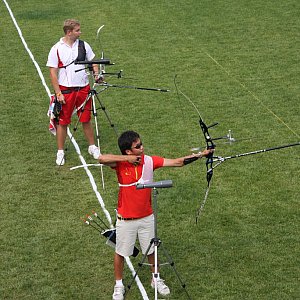 Na tory przyjechałem praktycznie jako pierwszy. Jeszcze był taki fajny spokój i cisza. Rozłożyłem łuki i zrobiłem rozgrzewkę na pięciu metrach. Strzeliłem jakieś dwadzieścia strzał z zamkniętymi oczami aby moje mięśnie przypomniały sobie odpowiednie ruchy. Później parę serii z ośmiu, dziewięciu strzał na siedemdziesiąt metrów i już wzywają na pojedynek.