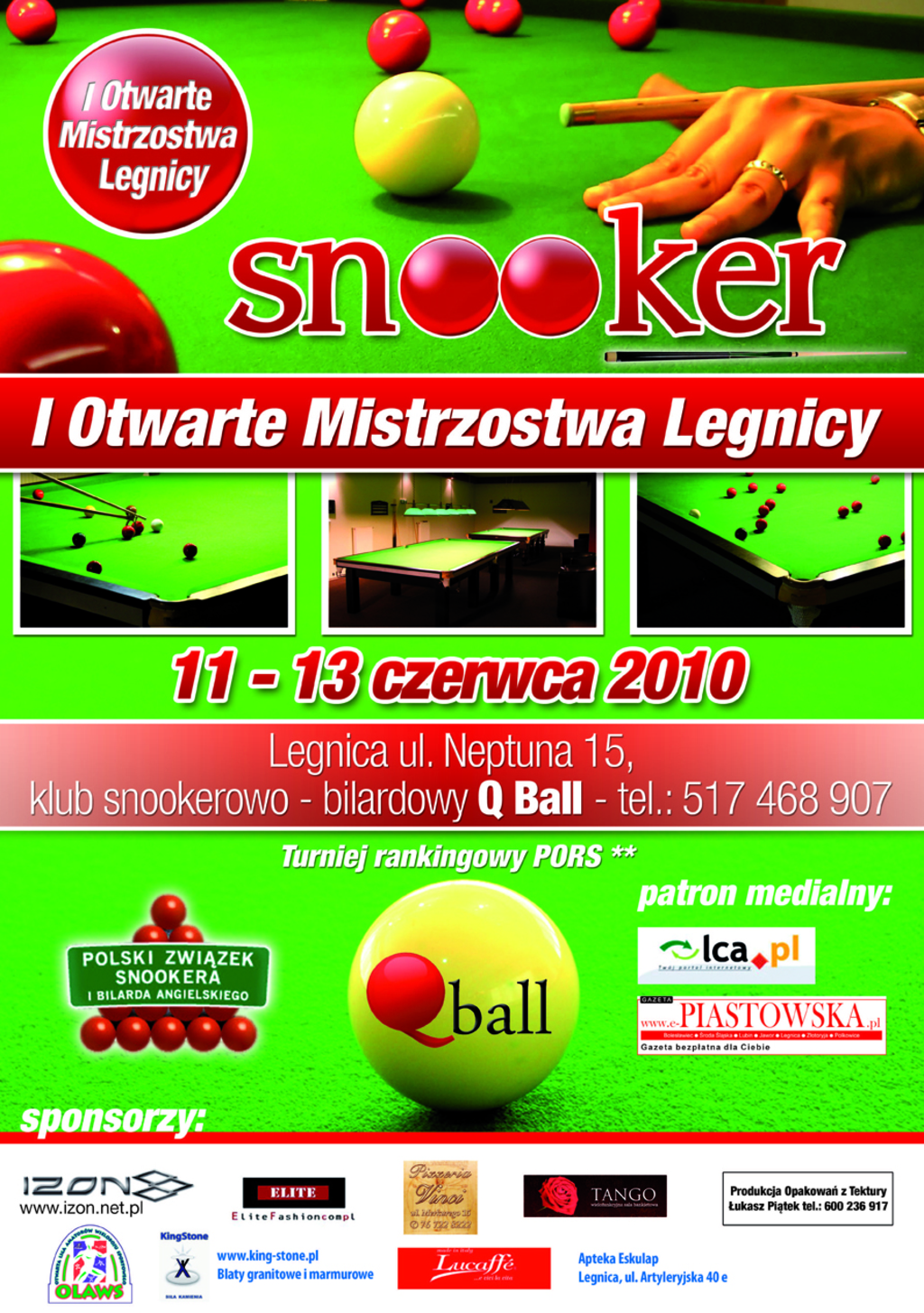 I Otwarte Mistrzostwa Legnicy w Snookera będą największym wydarzeniem snookerowym w historii naszego miasta. Zawody zostaną rozegrane w nowopowstałym klubie bilardowo-snookerowym Q Ball.
