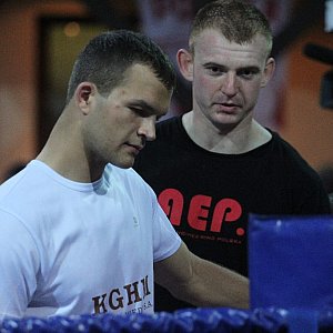 Wieczór rozpoczęły pojedynki kickbokserów startujących dopiero do poważnej kariery. Michał Filozof (Vorenus Jawor) walczył z Rafałem Cyrankowskim (Olimp Legnica), a Adam Pałasz (Shidokan Jelenia Góra) z Grzegorzem Lenardem (Prych Team).[FOTORELACJA]4947[/FOTORELACJA]