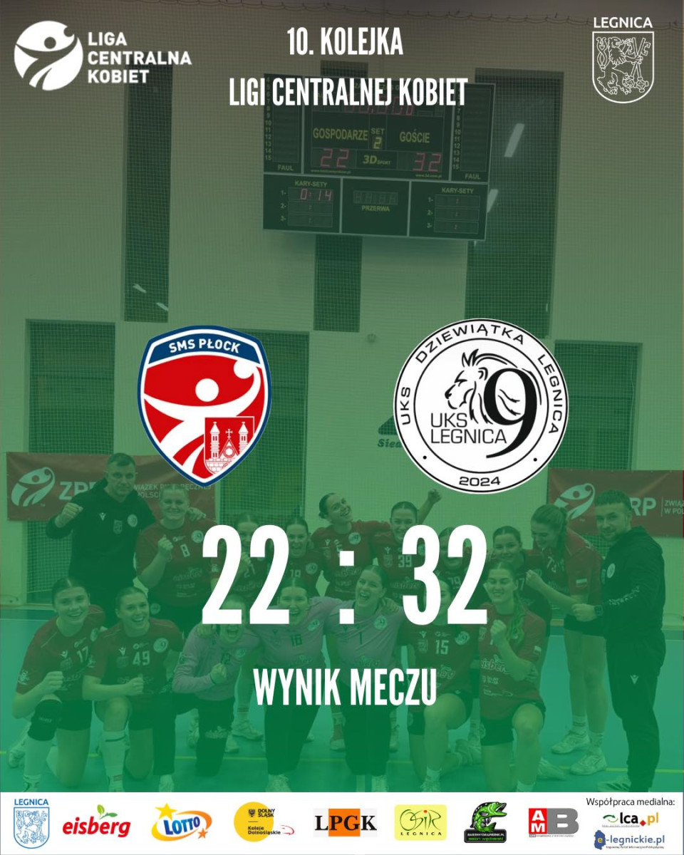 EISBERG Dziewiątka Legnica pewnie pokonała na wyjeździe SMS ZPRP I Płock 32:22 (15:9), dokładając cenny komplet punktów w mikołajkowy weekend i umacniając swoją pozycję w tabeli Ligi Centralnej Kobiet. Znakomity występ zanotowała Kinga Bogacka, która rzuciła 7 bramek, a legniczanki praktycznie od pierwszych minut kontrolowały przebieg spotkania.
