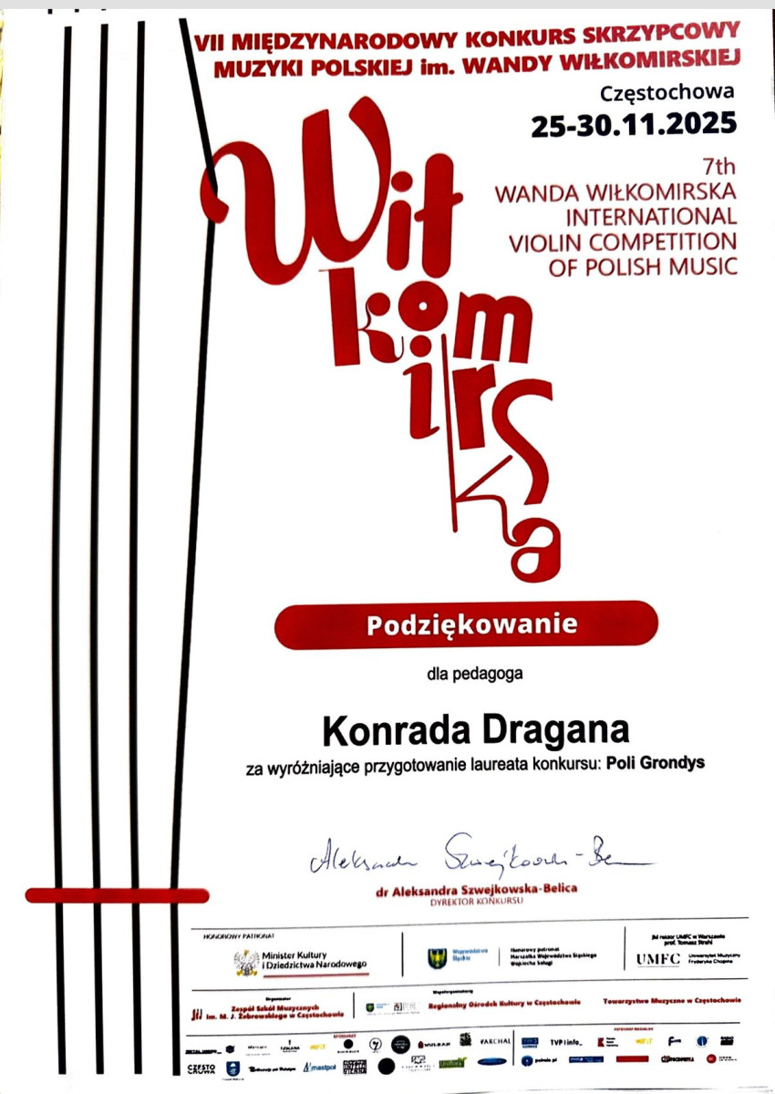 Jury doceniło wysoki poziom przygotowania młodych legnickich skrzypków. Pola Grondys zdobyła V miejsce w grupie III, natomiast Natalia Dragan wywalczyła I miejsce w grupie III oraz otrzymała nagrodę specjalną w postaci występu z orkiestrą kameralną.