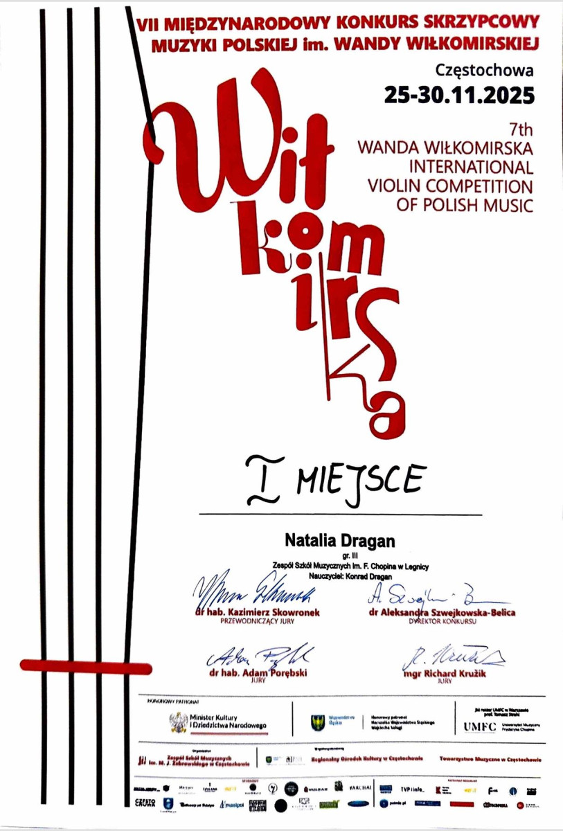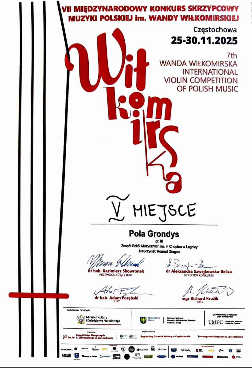 Uczniowie Zespołu Szkół Muzycznych im. Fryderyka Chopina w Legnicy bardzo dobrze zaprezentowali się podczas VII Międzynarodowego Konkursu Skrzypcowego im. Wandy Wiłkomirskiej w Częstochowie.