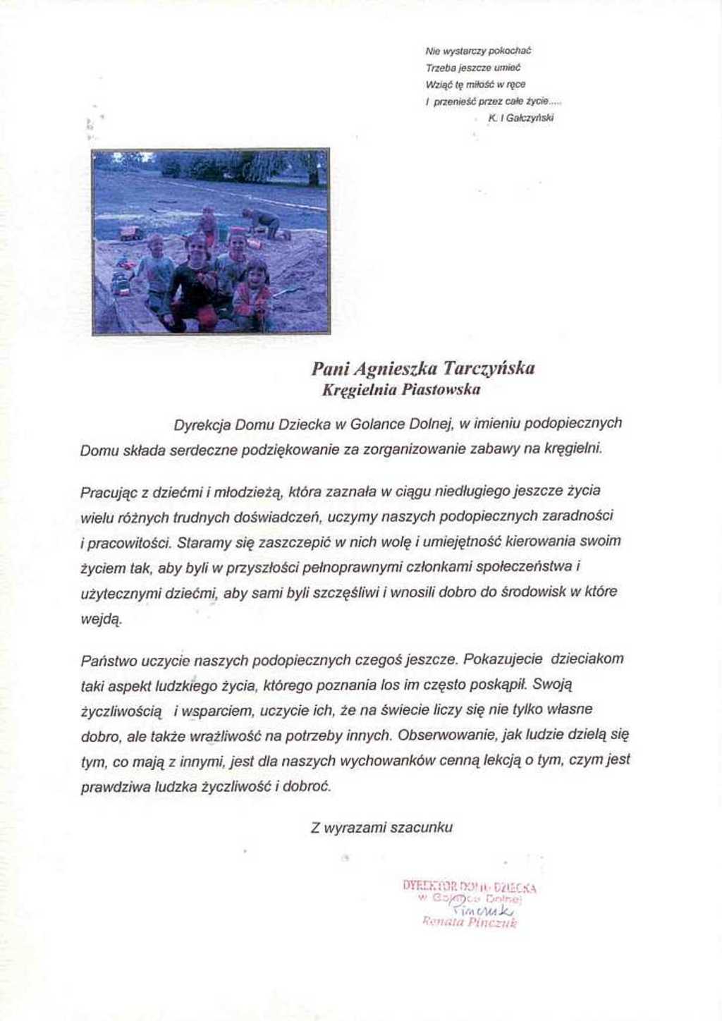 Znalazły się w nim bardzo znamienne słowa o tym, jak postrzegana jest bezinteresowna pomoc :” …pokazujecie dzieciakom taki aspekt życia, którego poznania los im często poskąpił. Swoją życzliwością i wsparciem uczycie ich, że na świecie liczy się nie tylko własne dobro, ale także wrażliwość na potrzeby innych. Obserwowanie, jak ludzie dzielą się tym, co mają jest dla naszych wychowanków cenną lekcją o tym, czym jest prawdziwa ludzka życzliwość i dobroć.”