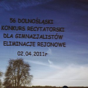 Gimnazjaliści walczyli o nominację do 56. Ogólnopolskiego Konkursu Recytatorskiego odbywającego się pod patronatem Ministerstwa Kultury i Dziedzictwa Narodowego. Zmaganiom przyglądała się komisja w składzie: Teresa Dąbrowska – polonista ZSO NR 3 Legnica, Barbara Stec – romanista z S P 19, metodyk ODMiDN Legnica, Anna Czerska – muzyk MCK Legnica, Bogusława Cybulak – instruktor teatralny MCK Legnica