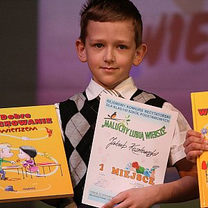 Jakub Kozłowski ze szkoły podstawowej nr 14 w Lubinie zwyciężył w rejonowym konkursie recytatorskim dla klas drugich.