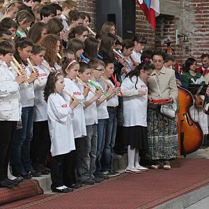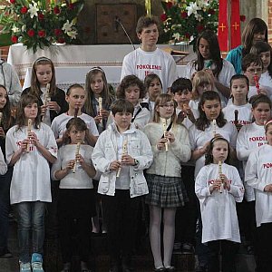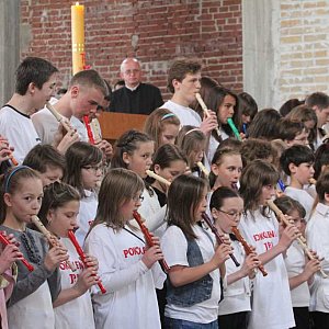 Zanim rozpoczęła się msza w kościele zabrzmiała barka grana na sto fletów i jeden akordeon. Dzieci ubrane w koszulki POKOLENIE J P II grając ukochany przez naszego papieża utwór w ten sposób uczcili Jego pamięć i dzień Jego beatyfikacji. Młodzieży akompaniował na akordeonie Witold Klocek, który cały występ przygotował. We mszy świętej uczestniczył też Zespół Pieśni i Tańca Legnica. [FOTORELACJA]3217[/FOTORELACJA]
