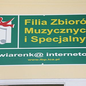 Placówka powstała w 1991 r. od tego czasu zajmuje się gromadzeniem i udostępnianiem płyt, kaset, książek i czasopism, wśród których wyróżnić można: 1.024 płyty analogowe, 2.684 płyty CD, 724 kasety magnetofonowe, 182 kasety video (głównie lektury szkolne i bajki), 900 książek popularyzujących muzykę i 9 tytułów czasopism muzycznych. Biblioteka wyposażona jest w wysokiej klasy sprzęt, który umożliwia odtwarzanie na miejscu nagrań z kaset i płyt. Zbiory muzyczne można także, po wpłaceniu kaucji, wypożyczać do domu. Filia prowadzi różnorodne formy pracy, mające na celu edukację muzyczną dzieci i młodzieży. Szczególnym zainteresowaniem cieszy się organizowany rokrocznie konkurs „Galeria przyjaciół Kapitana Muzyczki”.(lbp)
