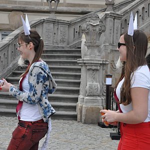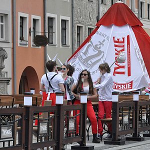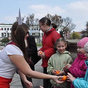 Pięcioro wolontariuszy Festiwalu Teatru Nie-Złego zachęcało najmłodszych legniczan do przyjścia na przedstawienie familijne "Koziołek Matołek". W spektaklu zagrają aktorzy z Warszawy.