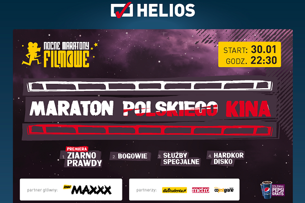 Początek Maratonu Polskiego Kina 30 stycznia o godz. 22:30, koniec 31 stycznia o godz. 6:30.