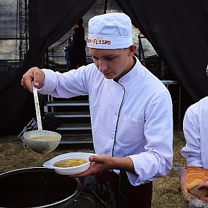 -Przygotowaliśmy kiszkę ziemniaczaną z wędzonym boczkiem i zasmażaną cebulką oraz grochówkę – mówi Dawid Ciąpała. - Na kiszkę zużyliśmy około stu kilogramów ziemniaków, czterdziestu kilogramów boczku i i piętnastu kilogramów cebuli. Do tego ugotowaliśmy 250 litrów zupy.