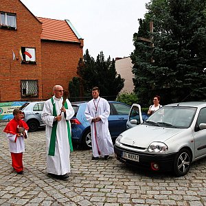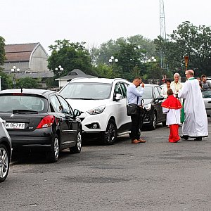 Kilkudziesięciu kierowców przyjechało swoimi pojazdami na parking przed parafią Matki Bożej Królowej Polski. Po mszy odbyło się poświęcenie pojazdów.