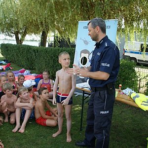 W dalszej części był pokaz zaprezentowany przez policjantów dotyczący akcji ratowniczej prowadzonej podczas topiącej się osoby i udzielania jej pierwszej pomocy przedmedycznej. Każde dziecko mogło nauczyć się i wykonać resuscytację krążeniowo-oddechową na fantomie. Funkcjonariusze uświadamiali najmłodszych ile zaangażowanych jest sił i środków podczas akcji ratowniczej.