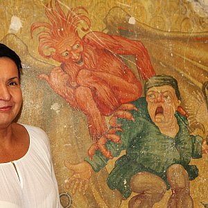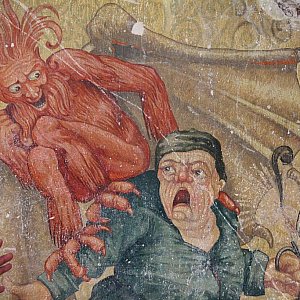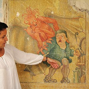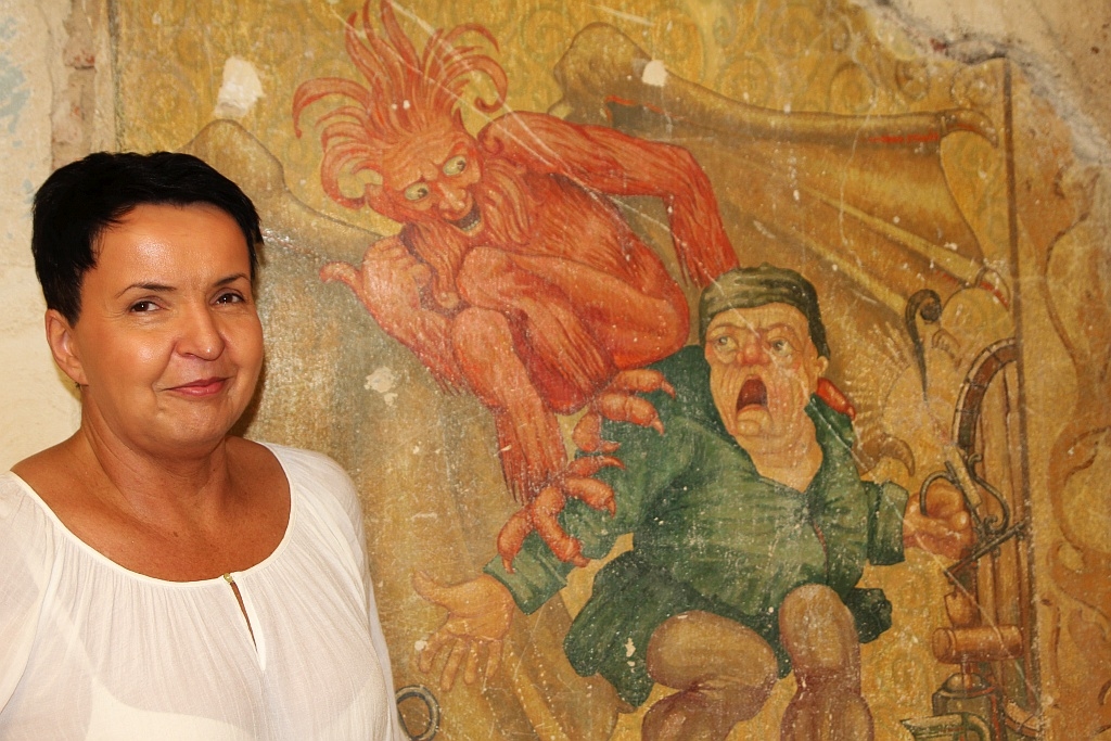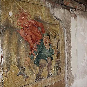 Po oczyszczeniu ścian polichromie „mówią” o sobie więcej niż pół roku temu. Nadal jednak interpretacja tego, co jest na ścianach,to tylko dywagacje. Skrzydlaty diabeł z żółtymi oczyma zębiskami, zakręconymi rogami i skrzydłami, za ramię trzyma pazurami przerażonego delikwenta, nie wiadomo czy to mężczyzna czy kobieta, który być może zakradł się do piwniczki spożył za dużo trunków.