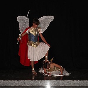 Spektakl zatytułowany „Pod skrzydłem Anioła” to opowieść o bohaterstwie, miłości, uczciwości, przyjaźni i wierze. Autorką scenariusza i reżyserem spektaklu była Dorota Gresiuk.