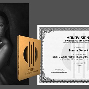 Zdjęcie „Maja” otrzymało tytuł BLACK WHITE PORTRAIT of The Year 2019, zdobyło 1 miejsce w kategorii Portrait single. Maja – to portret nastolatki, naturalny w swej prostocie, przyciągający wzrok wyeksponowaniem detali skóry, formą przekazu oraz ujmującą pozą i stylizacją.