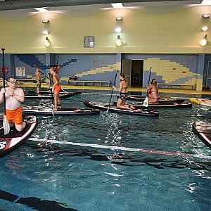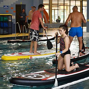 Pływania na desce bez żagla uczyli się miłośnicy sportów wodnych na basenie Delfinek. SUP staje sie dyscypliną popularną na całym świecie. To doskonała okazja na poprawę tężyzny fizycznej i trening przed sezonem letnim.