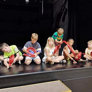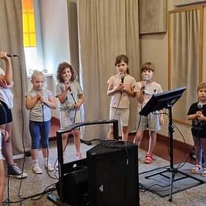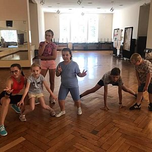 Na koniec zajęć grupa teatralno - wokalna wystąpiła przed rodzicami i dziećmi z pozostałych grup warsztatowych . W wykonaniu młodych artystów zobaczyliśmy krótki spektakl taneczno - wokalny zatytułowany „Witajcie w naszej bajce”. W ciągu zaledwie 5 dni dzieci stworzyły wspaniałe , dynamiczne i pełne pozytywnej energii przedstawienie.