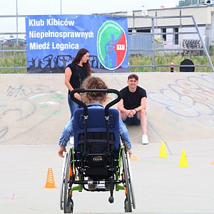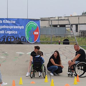 Osoby niepełnosprawne ruchowo przyjechali na skatepark uczestniczyć w grach i zabawach zorganizowanych przez Klub Kibiców Niepełnosprawnych Miedź Legnica.