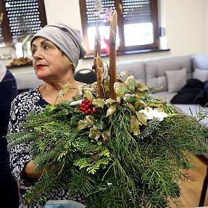 Część elementów, z których powstawały stroiki i wianki świąteczne, seniorzy przynieśli ze sobą. To, czego nie mieli w ogródkach i domach dostarczyła Zofia Słaboń-Róg, profesjonalna florystka, była właścicielka kwiaciarni.