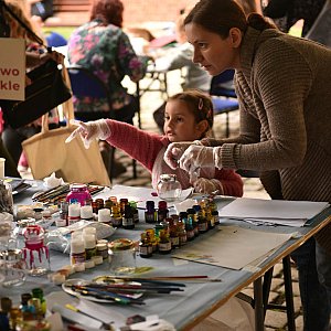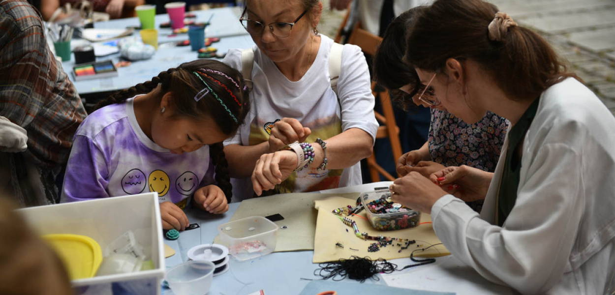 Podczas warsztatów dzieci mogły spróbować swoich sił w różnych technikach, tworząc biżuterię z recyklingu, malując na szkle, ćwicząc dot-painting, a także wykonując eko instrumenty, roślinne kolaże, kolorowe torby oraz lalki motanki.
