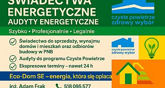 Promuj ogłoszenieWYKONUJĘ ŚWIADECTWA ENERGETYCZNE I AUDYTY ENERGETYCZNE Świadectwo charakterystyki energetycznej : - mieszkania - domu jednorodzinnego - domu wielorodzinnego - lokalu użytkowego Świadectwo jest niezbędne do: - Sprzedaży ... czytaj więcej